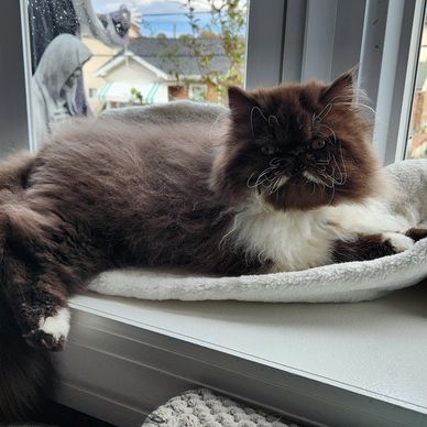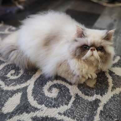 Petunia is a very unique, and beautifully marked tortie point and white. She is a true lovebug, likes being super, super close to you! Her dark face and blue eyes are a real stunning pair.